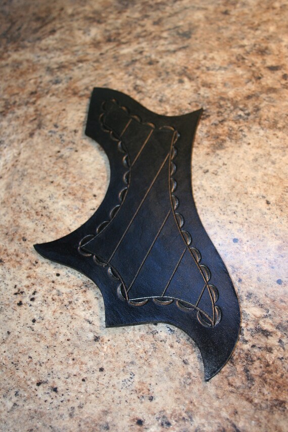 Jaguar guitar humbucker pickguard 3ply black. Hand dyed and painted leather. Real high grade veg tan leather made in oregon by hand. Make a cheap acoustic guitar play like an expensive guitar. Brown tortoise print on celluloid with dove and foliage printed overlay. One new leather acoustic pick guard with hand tooled and painted rose carving. It was shaped like a regular pickguard and wasn't much thicker either. Acoustic guitar pickguard pick guard soft scratch plate adhesive comma shape.