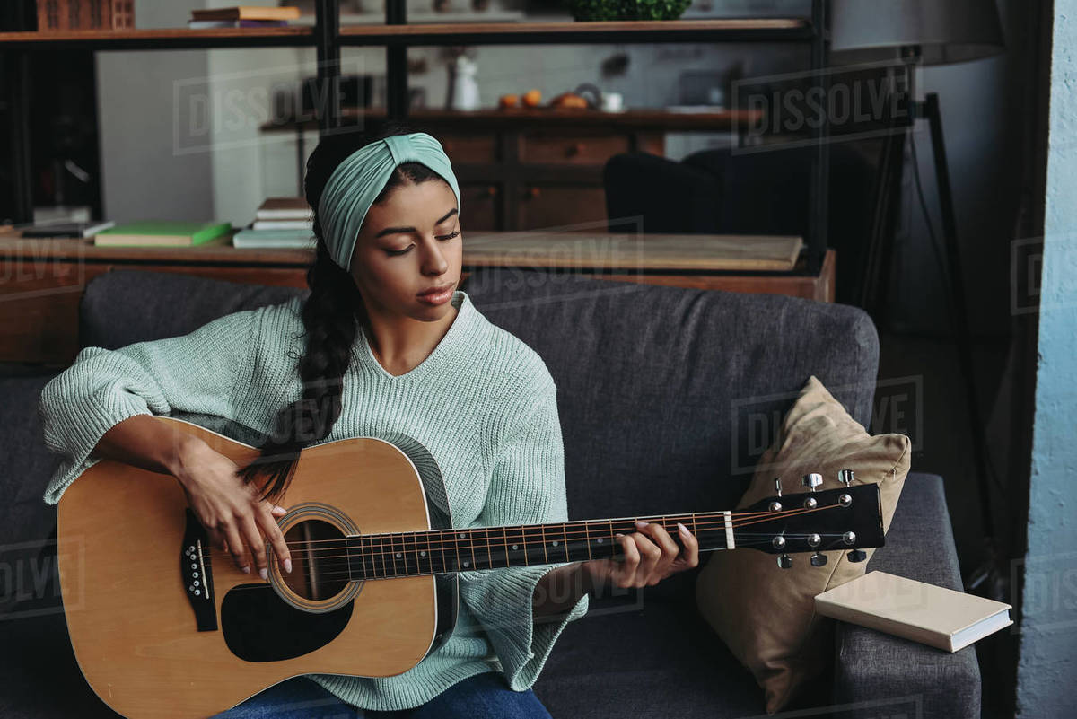 Turquoise Acoustic Guitar - Beautiful Mixed Race Girl In Turquoise Sweater And Headband Playing Acoustic Guitar On Sofa At Home Stock Photo Dissolve